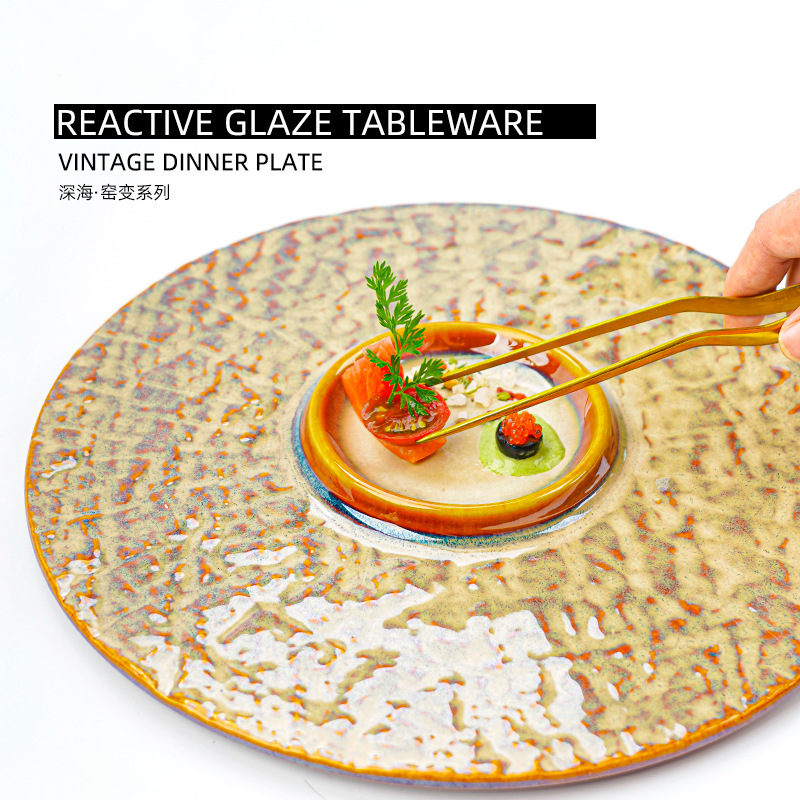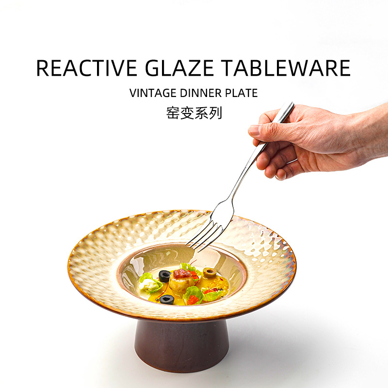 レトロ窯変筋理感創意石紋陶磁器麦わら帽子盤北欧個性デザート菓子サラダレストラン