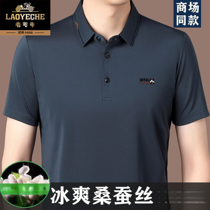 マルベリーシルクメンズ半袖Tシャツ夏中年ラペルPOLOカジュアルアイスシルクTシャツアンダーシャツ