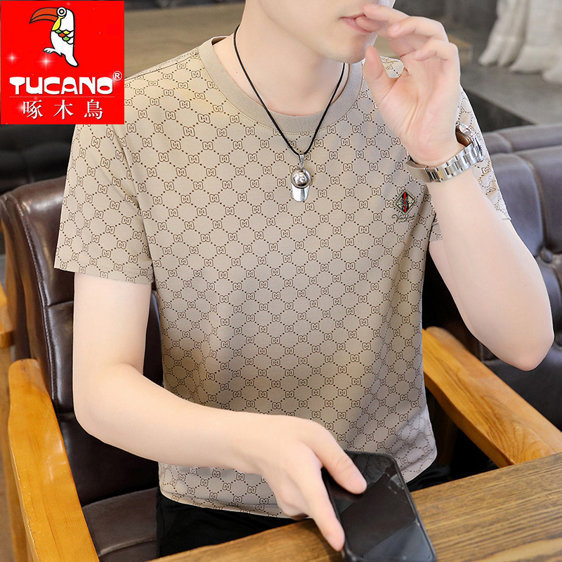 ウッドペッカーメンズ半袖 2025 夏の新トレンド Tシャツ半袖トップラウンドネックプリントアイスシルク Tシャツ男性用