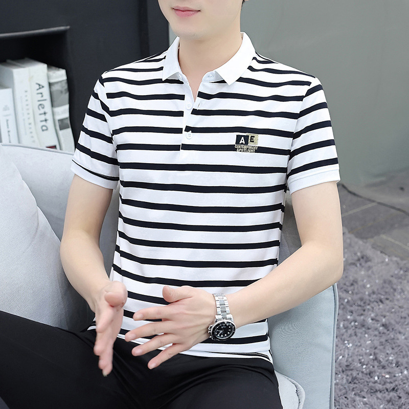 夏メンズラペルストライプ半袖Tシャツポロシャツ高級スリムメンズカジュアル半袖Tシャツ
