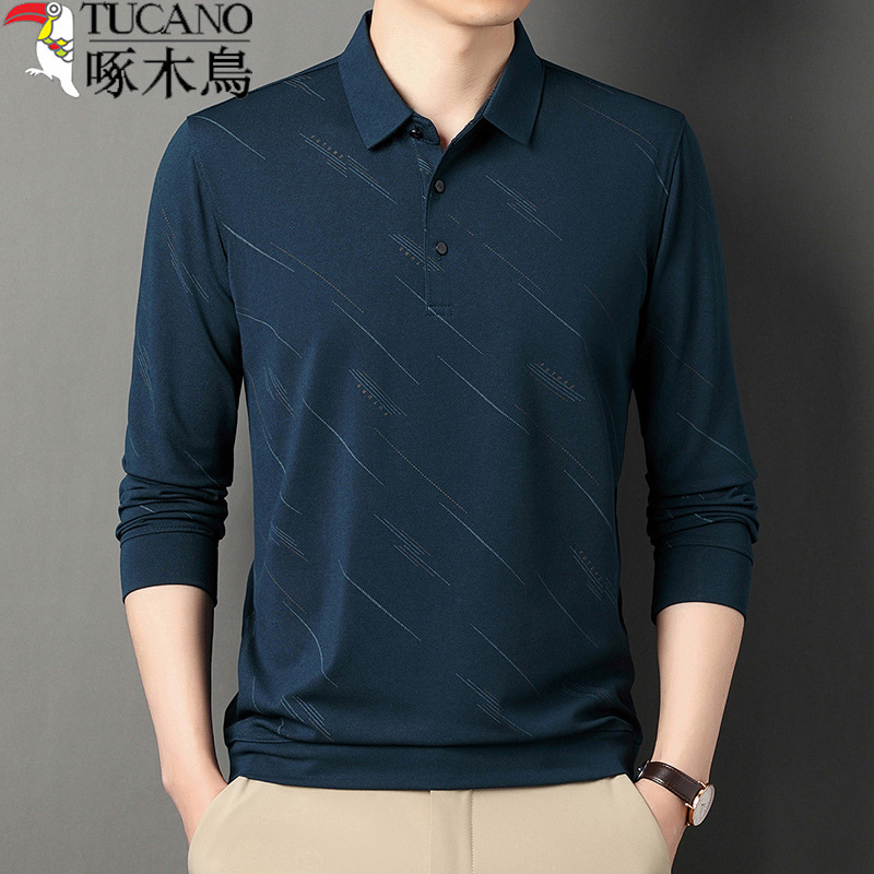キツツキ夏アイスシルク Tシャツメンズ長袖 2025 新しい中年カジュアルラペル薄いお父さん Tシャツ