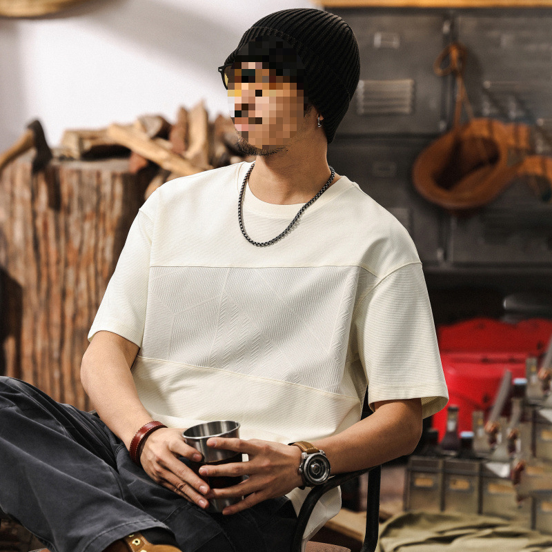 新疆綿カラーブロック半袖メンズ夏 2025 新しいアメリカンレトロルーズトップトレンディな 250 グラムヘビーウェイト Tシャツ