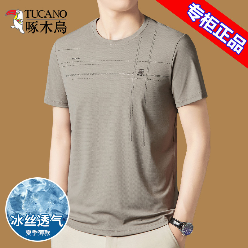 Woodpecker 夏メンズ半袖 Tシャツアイスシルクラウンドネック半袖シルケットコットントレンディなメンズトップス Tシャツアンダーシャツ