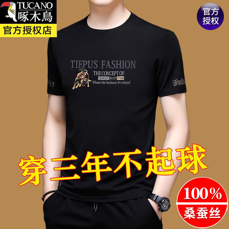 ウッドペッカー夏新作マルベリーシルクメンズ半袖Tシャツ半袖トップアイスシルク薄手カジュアルTシャツ男性用