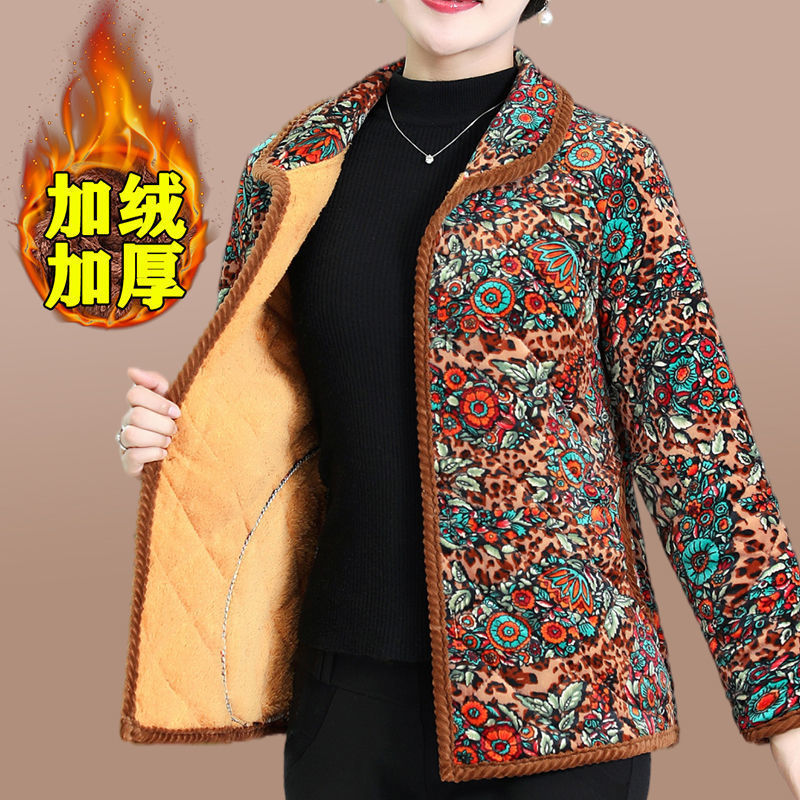 中高年女性の綿入り服、秋冬のベルベットと厚みのある母親の服、高齢者向けの長袖綿入り服、女性用の暖かい花柄の綿入りジャケット