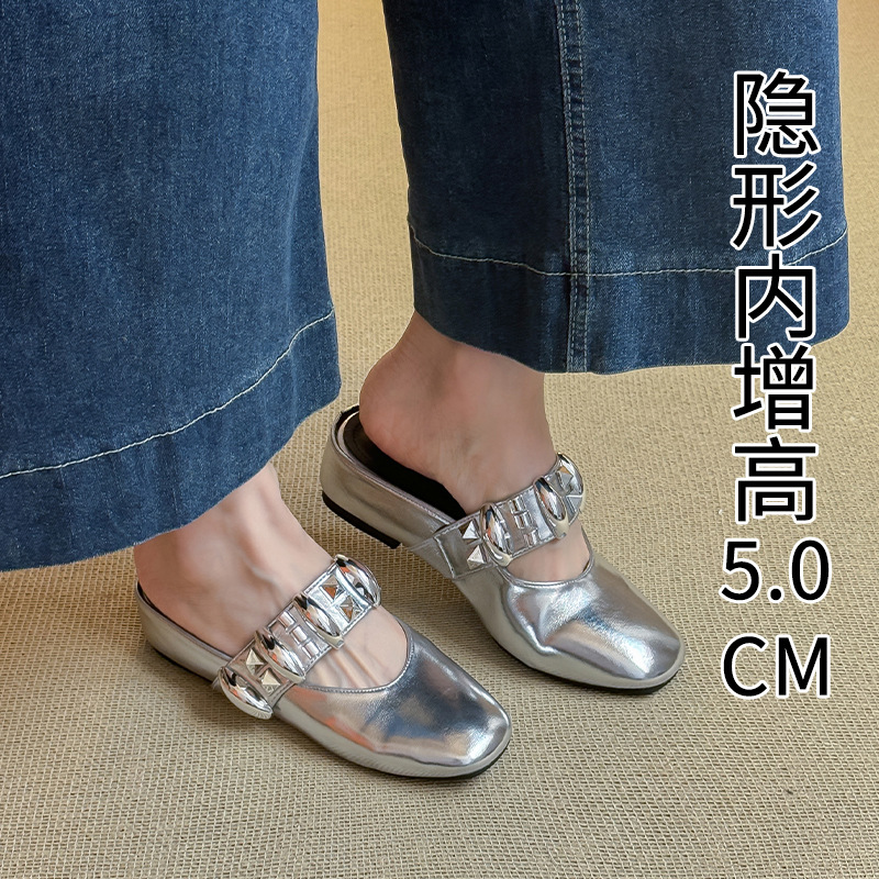 A63-1 フレンチスタイル5cm身長アップシルバーミュールシューズ、スパンコール付きメリージェーン、つま先が覆われたサンダル、女性用夏用外履き