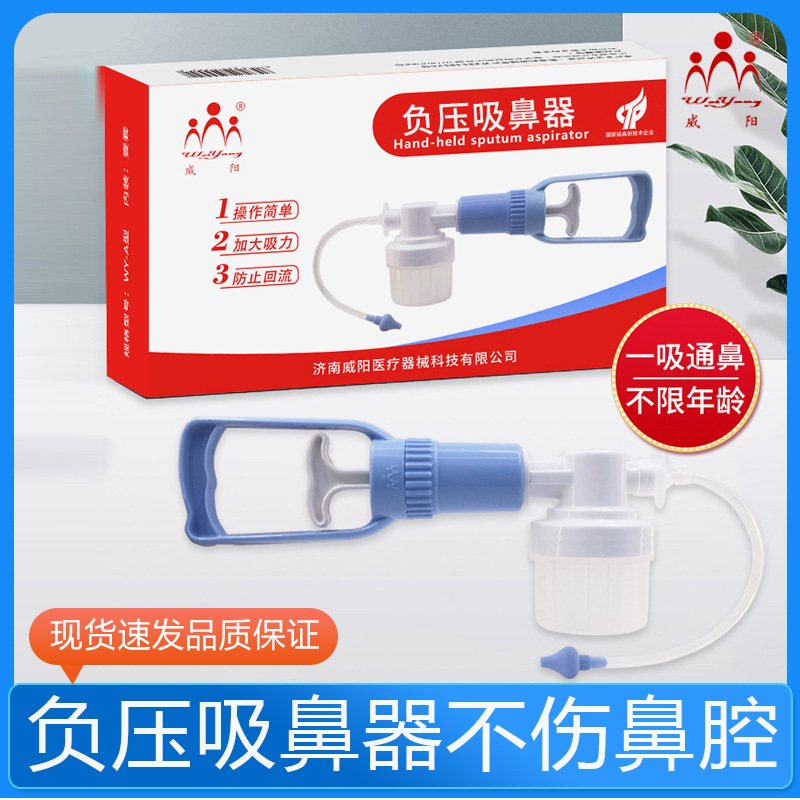 威陽の赤ちゃんは鼻を吸う器の子供の新生児の手で手を引いて鼻水を吸います。