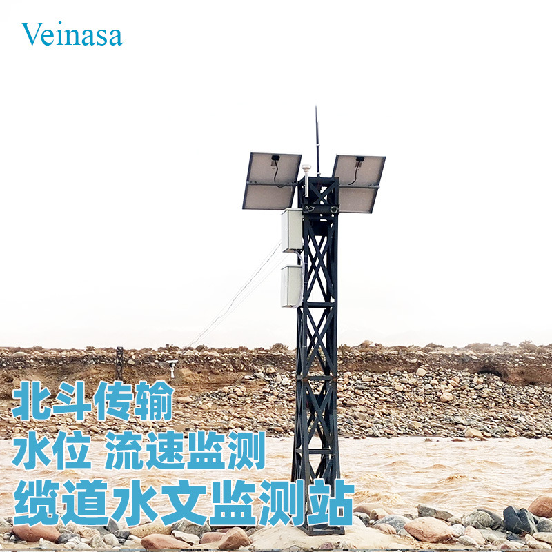 北斗ロープ道水文監視ステーションswaws 002鉄塔ロープ道は川の水位計の流量を越えて太陽エネルギーを測定します。