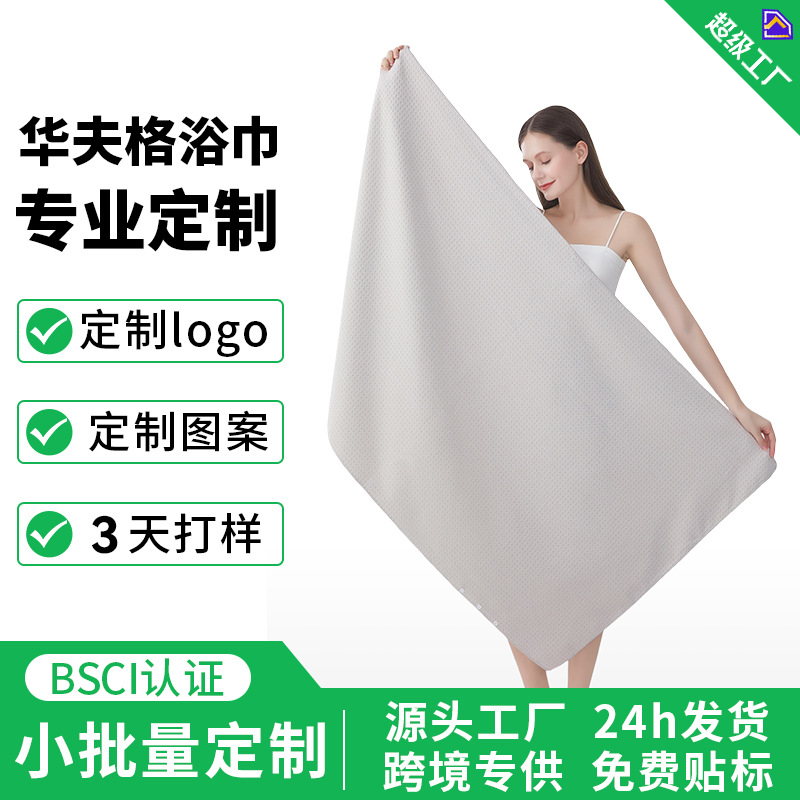 ロゴがプリントされたカスタマイズされたクロスボーダーワッフルビーチタオル、男性と女性用、家庭用入浴用糸くずの出ないラップタオル、吸収性バスタオル
