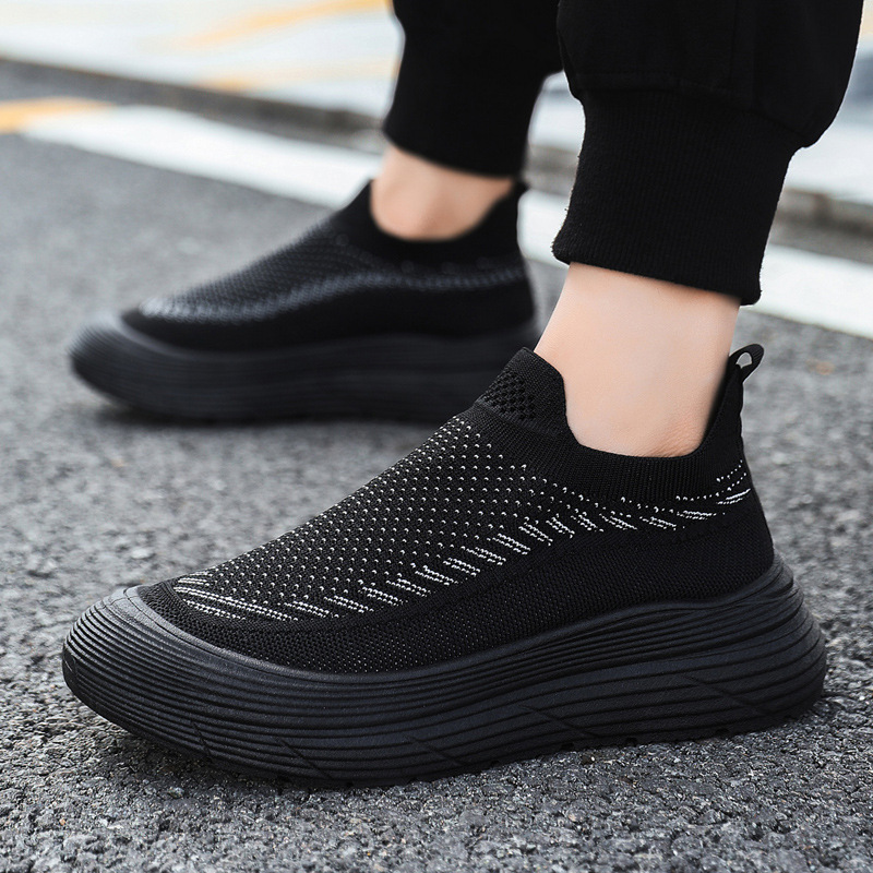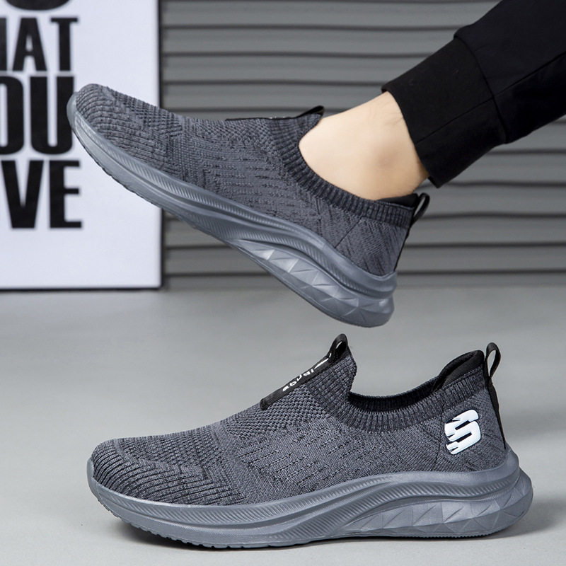 新しいスポーツとレジャーの紳士靴、フライウーブン通気性のあるスリッポン、中高年ウォーキングシューズ、滑り止め、快適で柔らかい底のお父さん靴