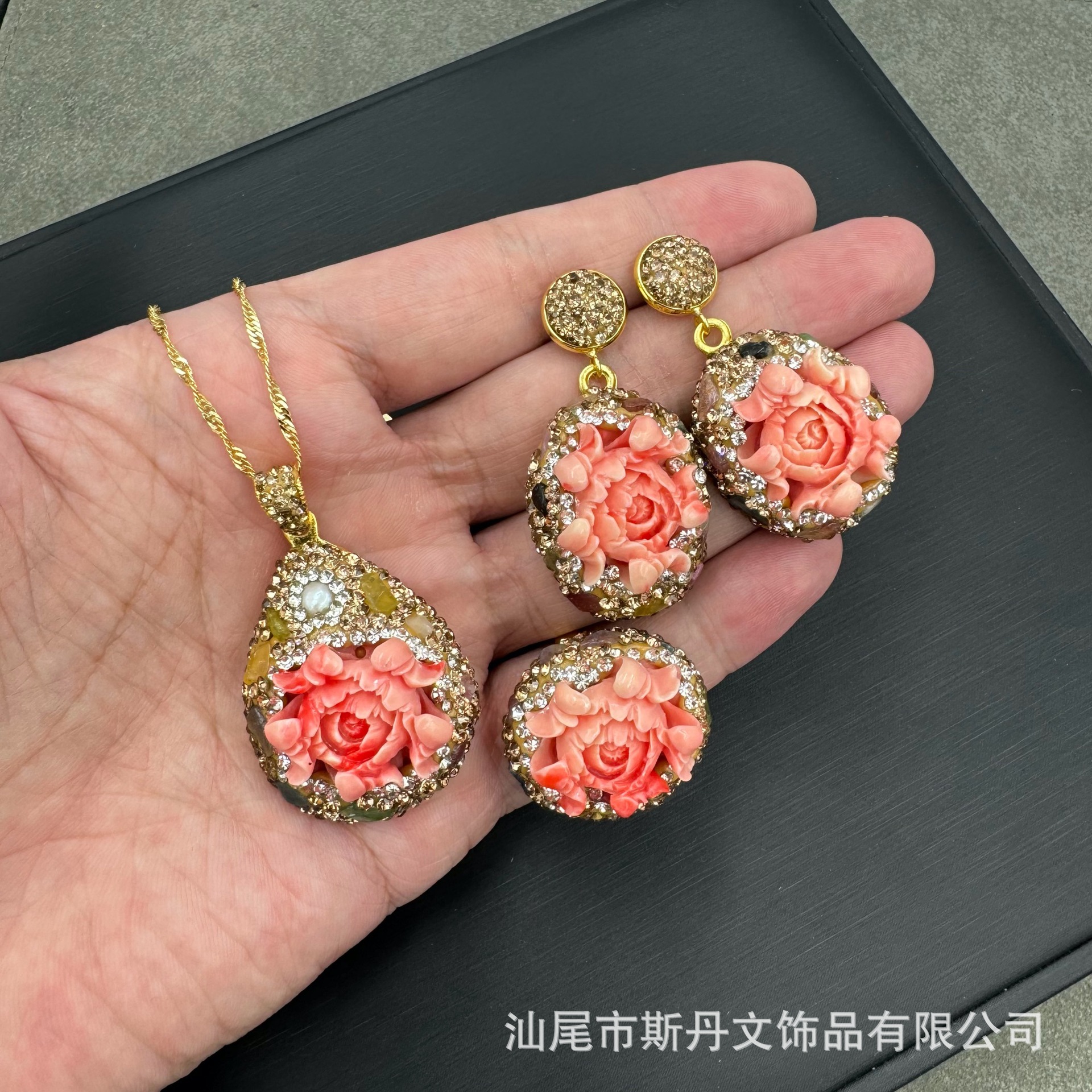新商品の国風牡丹の花の三点セットは手作業で彫刻します。