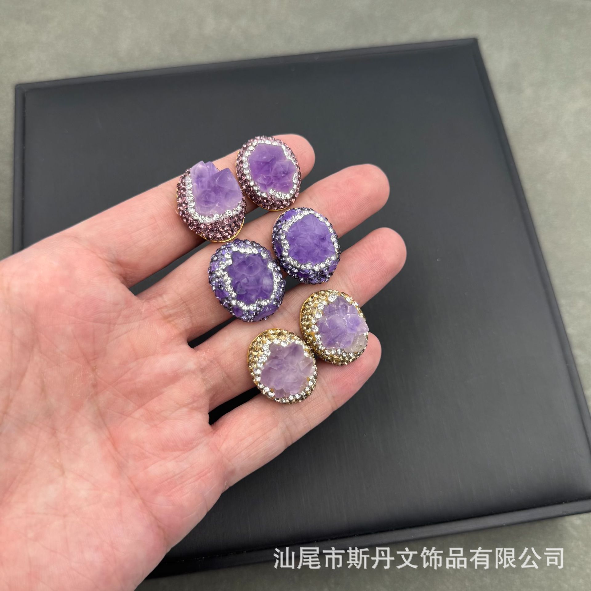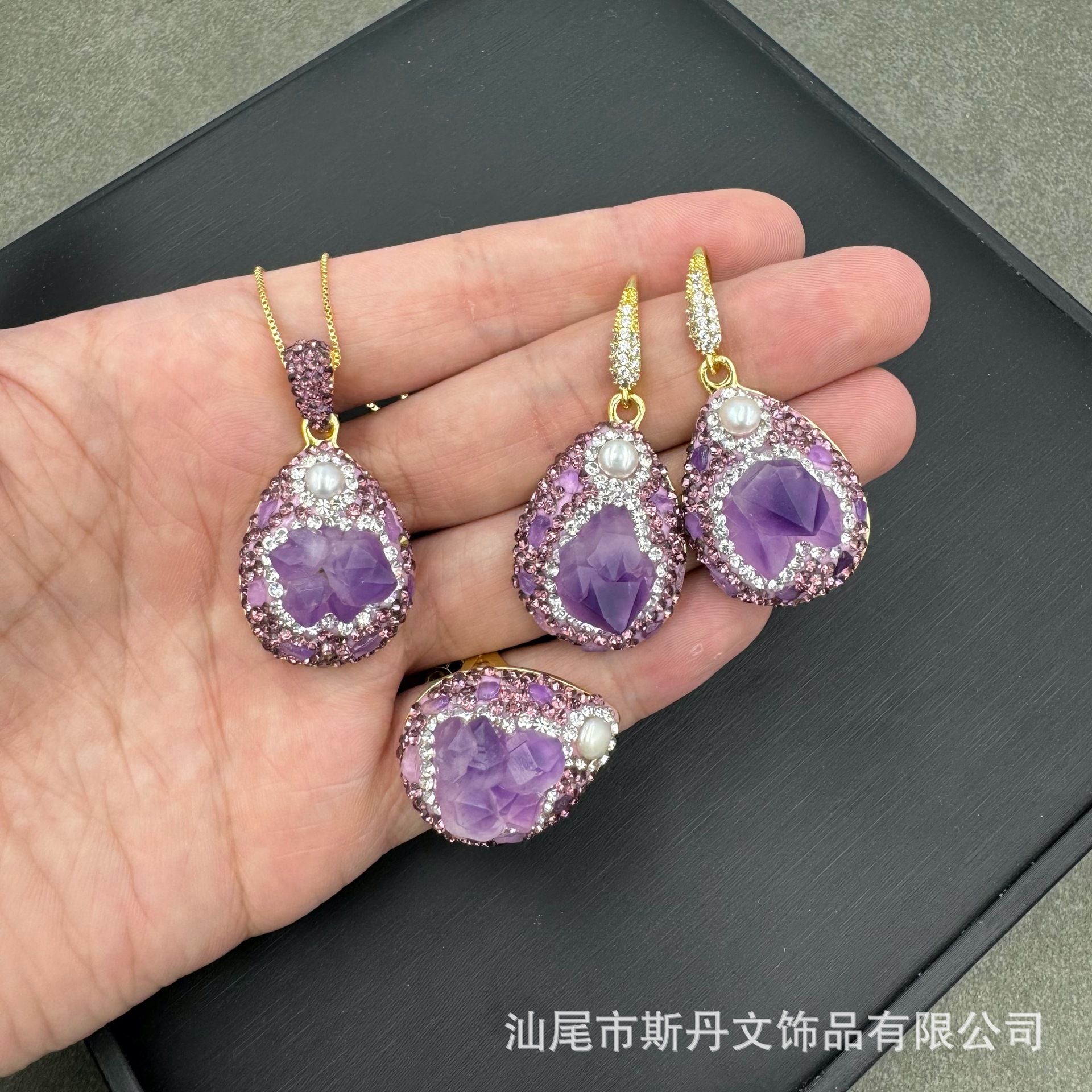 新型天然紫晶花真珠三点セットの大衆個性モザイク原石碧璽毛衣チェーン工場卸売り