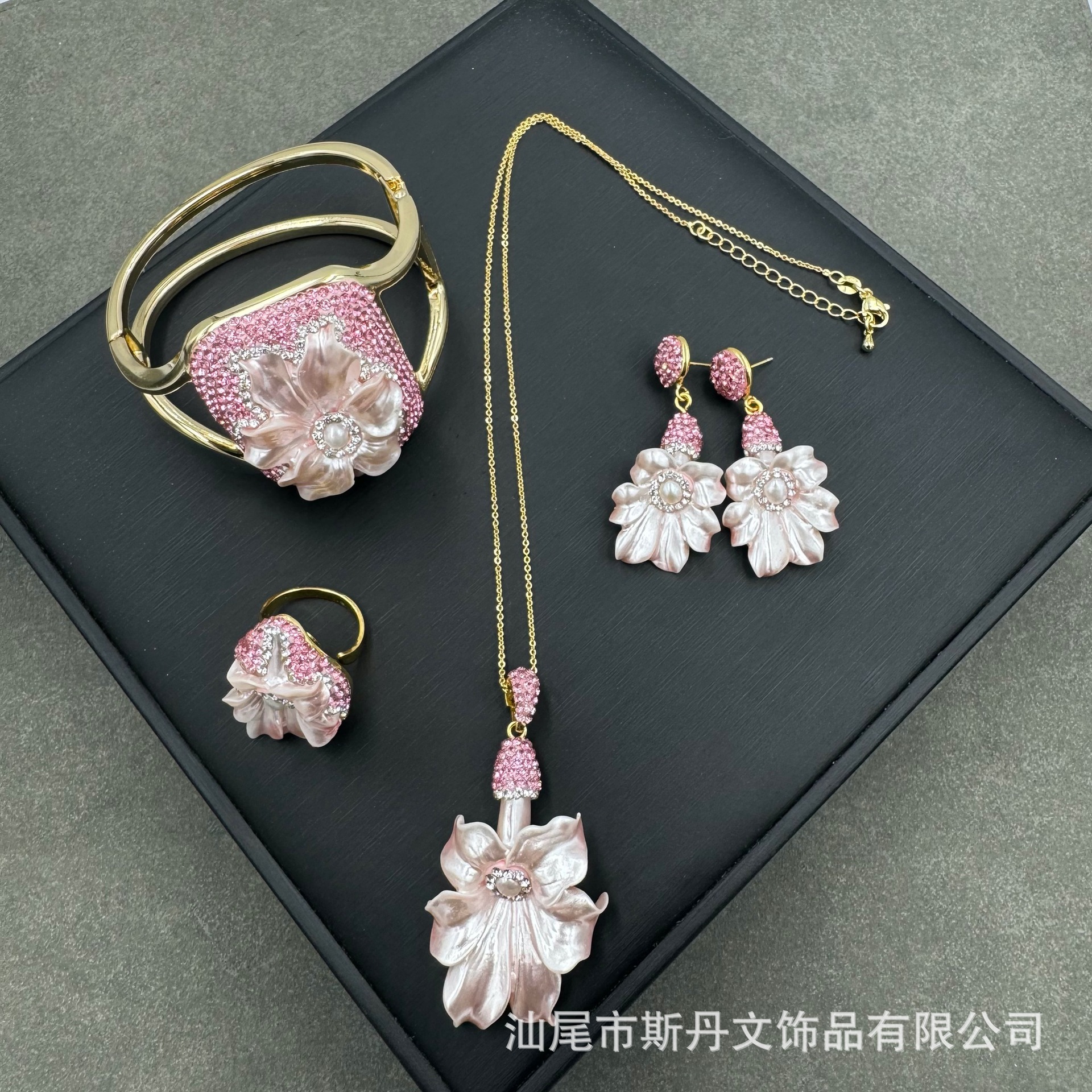 新型天然粉晶原石モザイクセットファッション高級軽豪華風チェコドリル個性アクセサリー三点セット