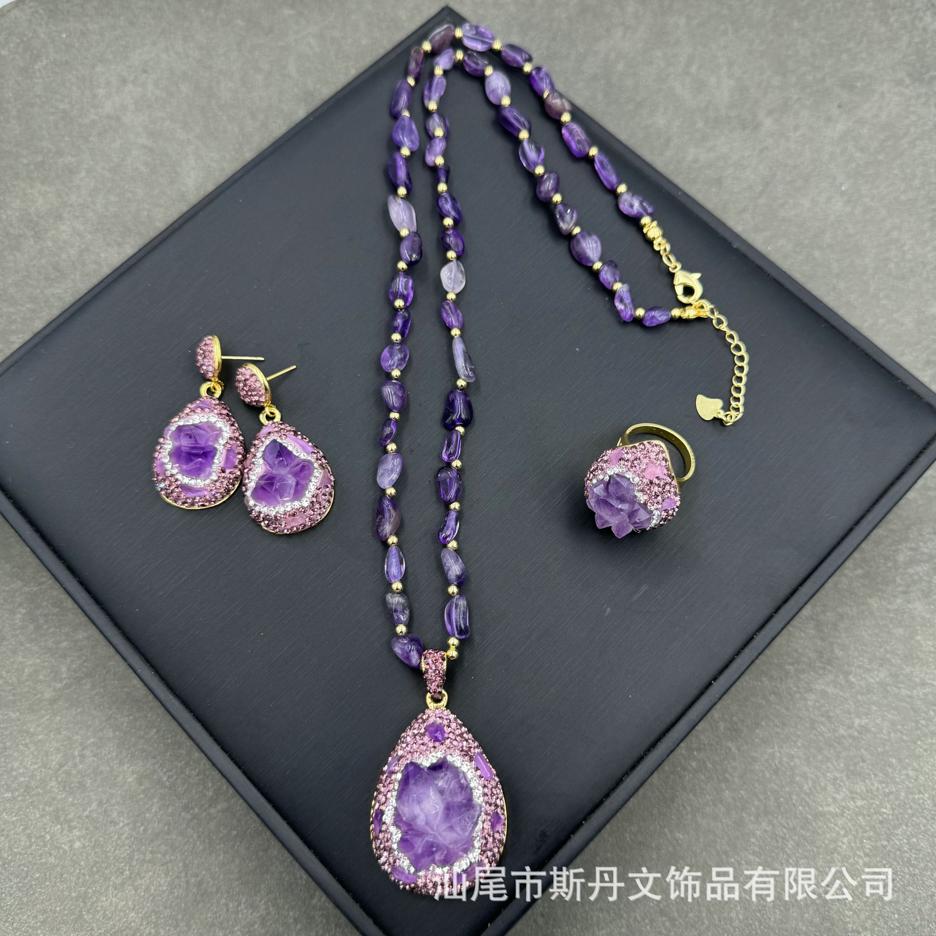 新天然原石紫水晶三点セット小衆個性アクセサリー高級毛衣チェーン手作りモザイクセット