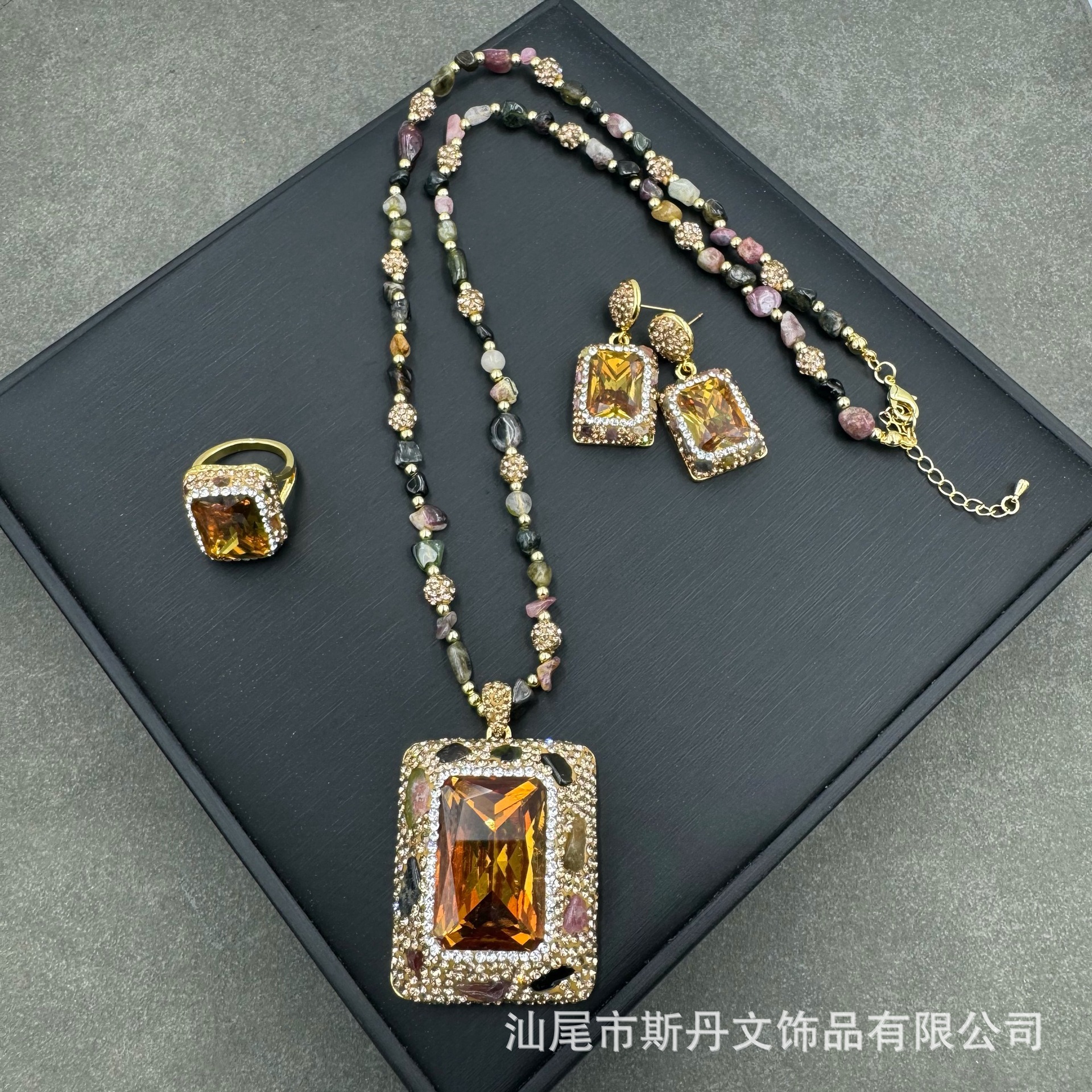新型天然バロック方形真珠碧璽セット個性セーターチェーン高級感モザイク三点セット