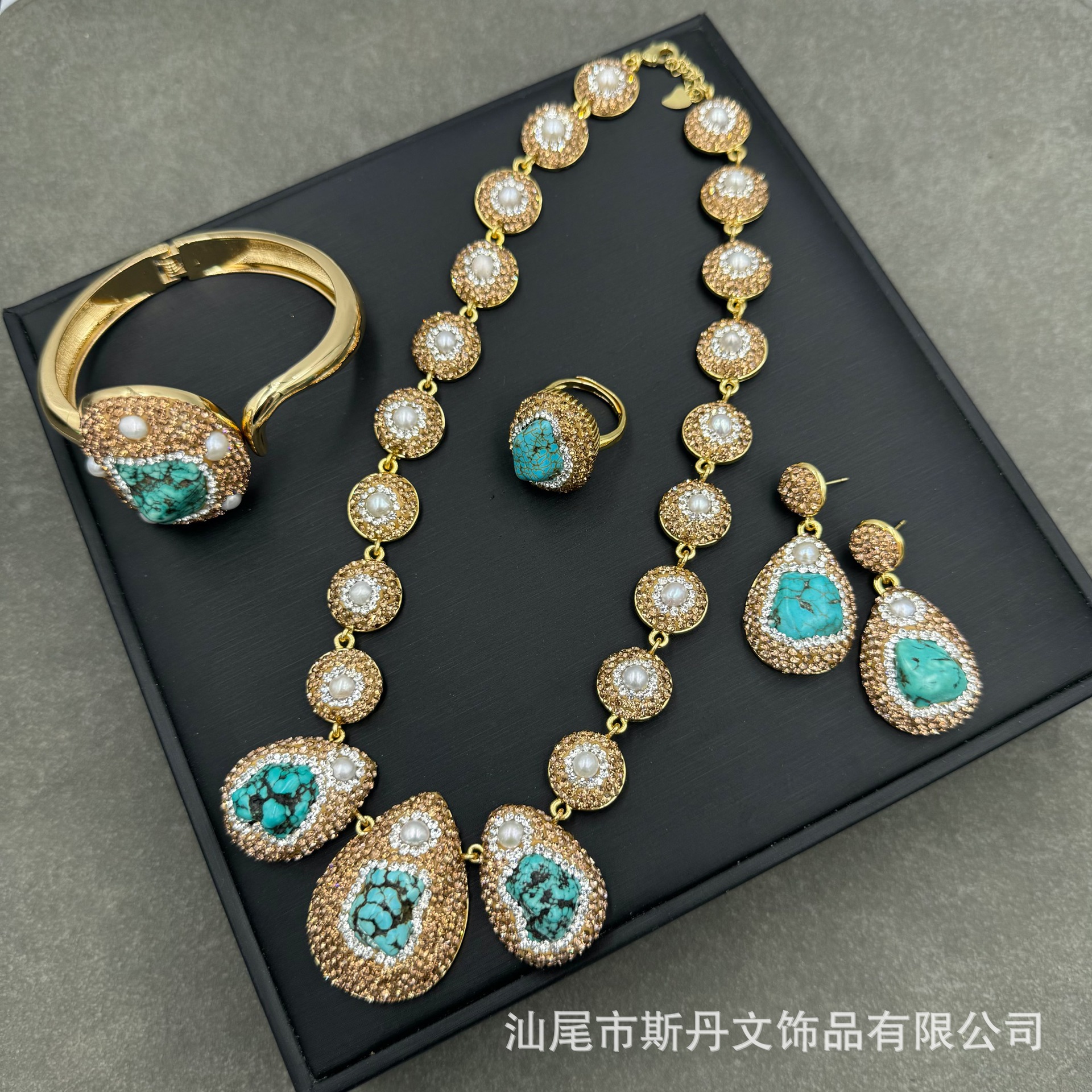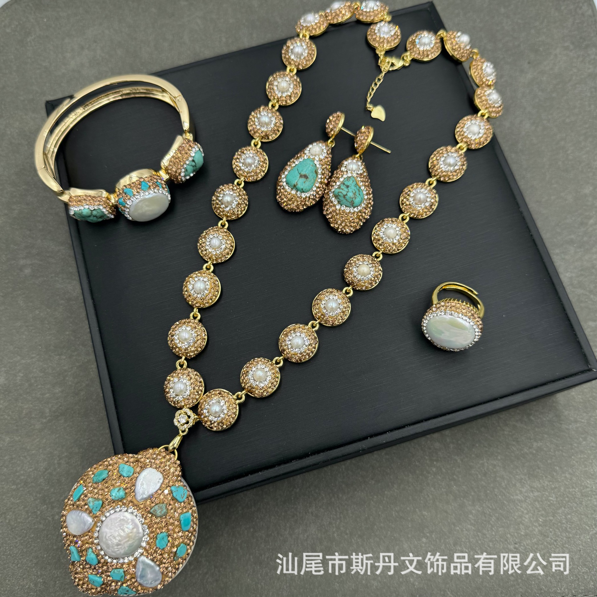 新商品中古松石ネックレス天然真珠象眼セット民族風小衆手作りチェコドリル四点セット