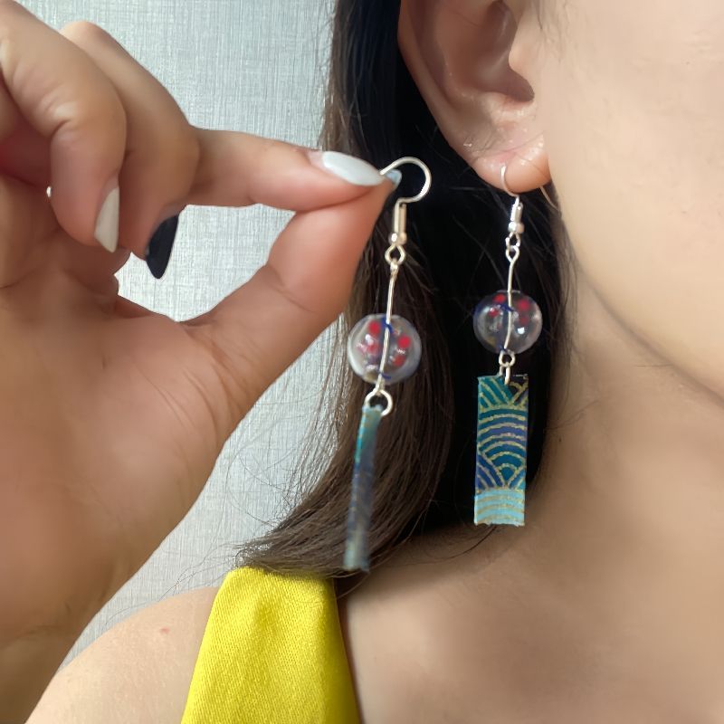 小紅書と同じスタイル、キュートでフレッシュな波模様のガラスボールイヤリング、神奈川和風イヤークリップ、風鈴