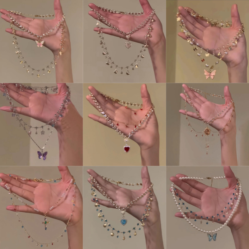 2024 新レトロアクアマリン二層ネックレス女性のピンク蝶ハイエンドライト高級絶妙な鎖骨チェーン