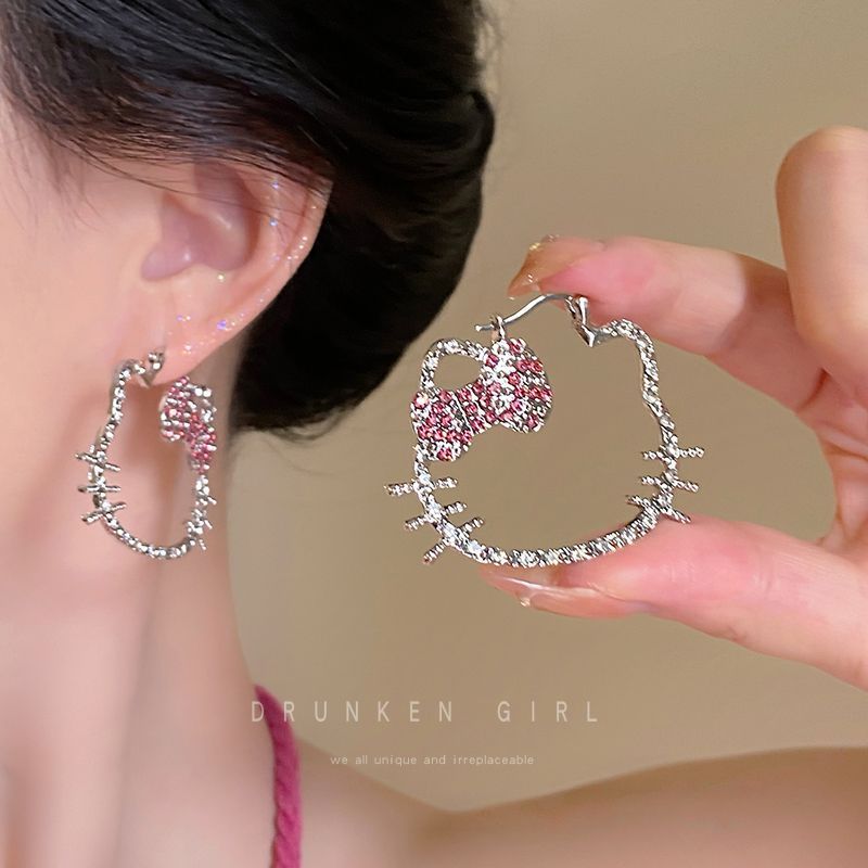 フルダイヤモンドキティシルバーイヤリングレディースレトロ誇張イヤリングかわいいハローkt猫大きなイヤリングイヤークリップ