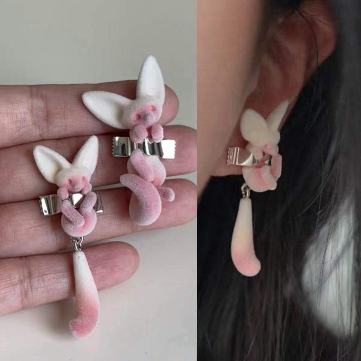 貼り付けられた2匹のキツネ ~ グラデーション粉非対称キツネピアス2024新型かわいい穴なし耳クリップ