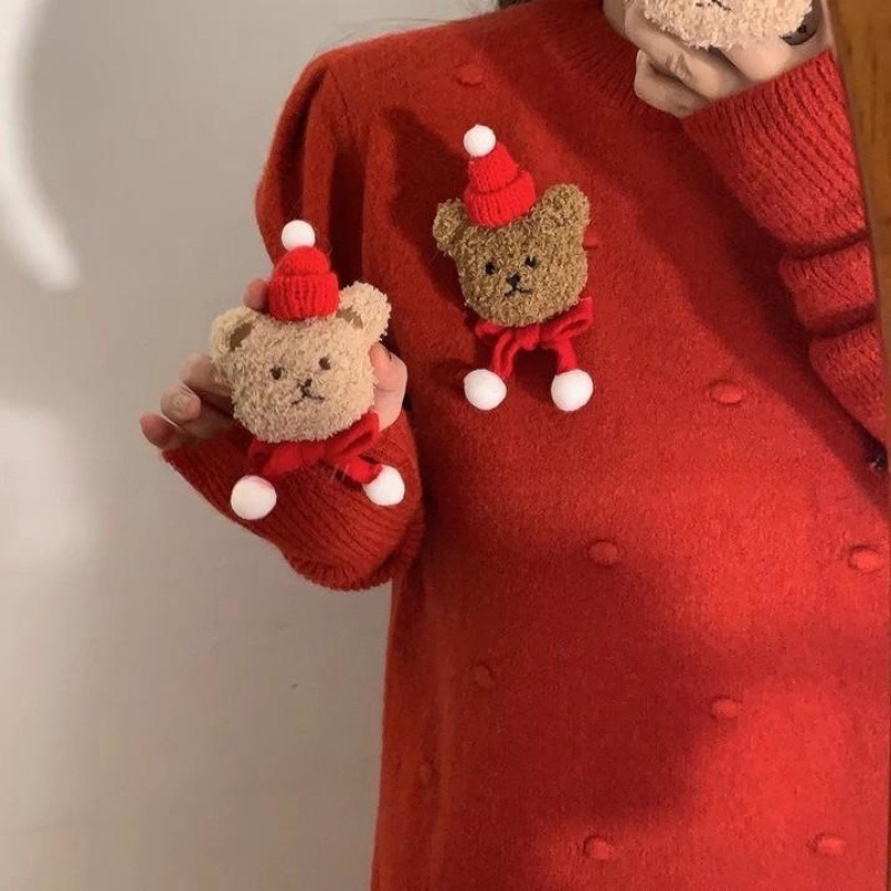 ぬいぐるみの熊のブローチ ~ かわいい赤いマフラーの帽子の熊の頭の漫画の人形の子供のピンの新年の胸の花の女