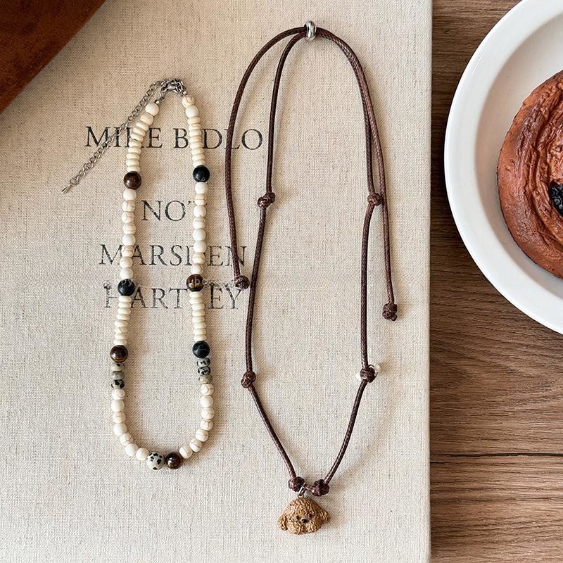 かわいい土の子犬のネックレスの女性のタイプのレトロなベージュの虎の目の石の数珠の二重の重ねは2024年の秋冬のセーターの鎖をつけます。