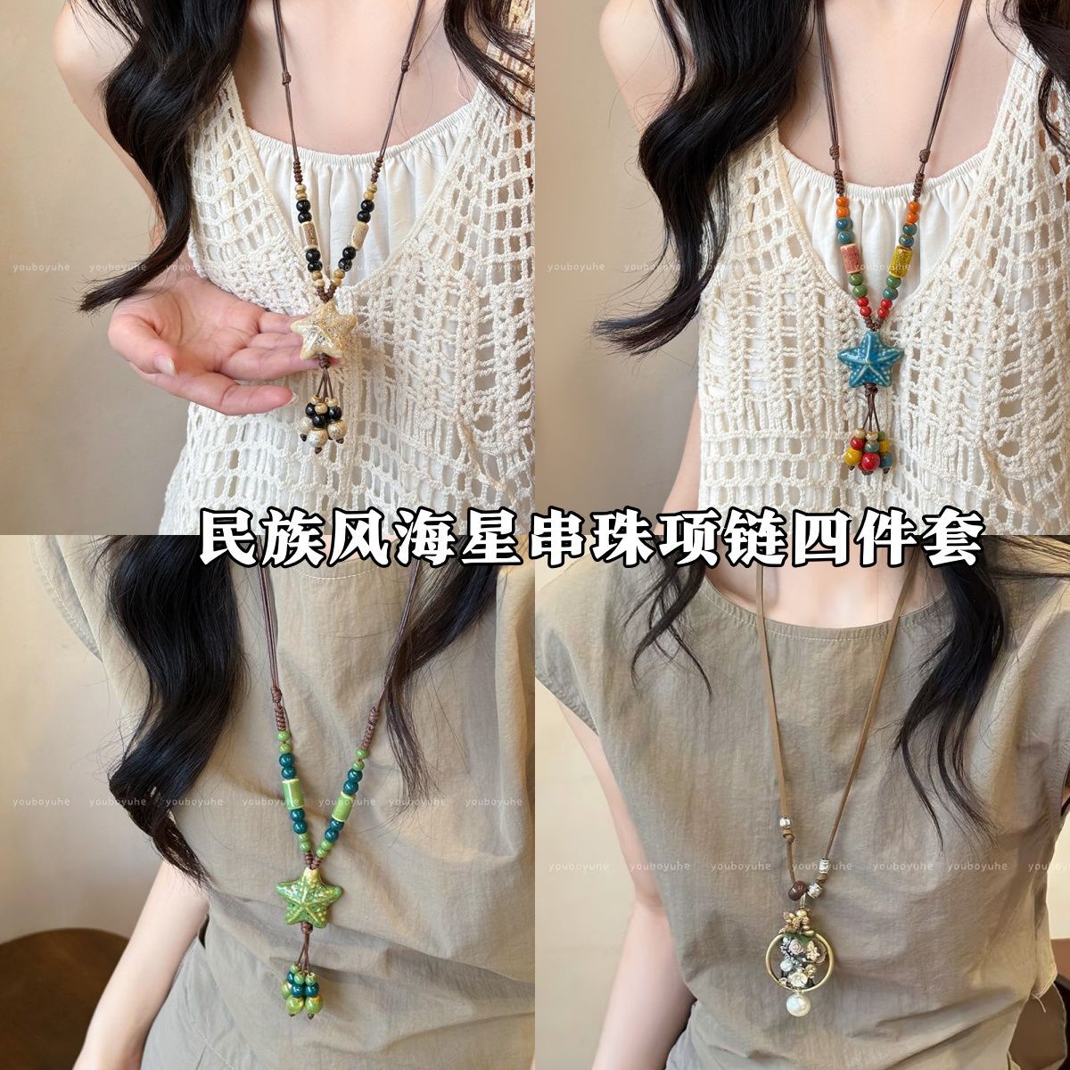 ボヘミアン陶磁器カラービーズ海星ネックレス女性レトロ民族風編み紐ロングスウェットチェーンアクセサリー