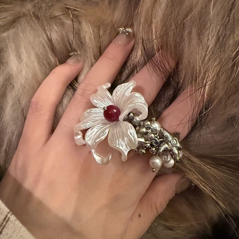 ALONEMOON オリジナルデザイン アイリスフラワー 二層シルバーパール ニッチデザイン ストレッチリング
