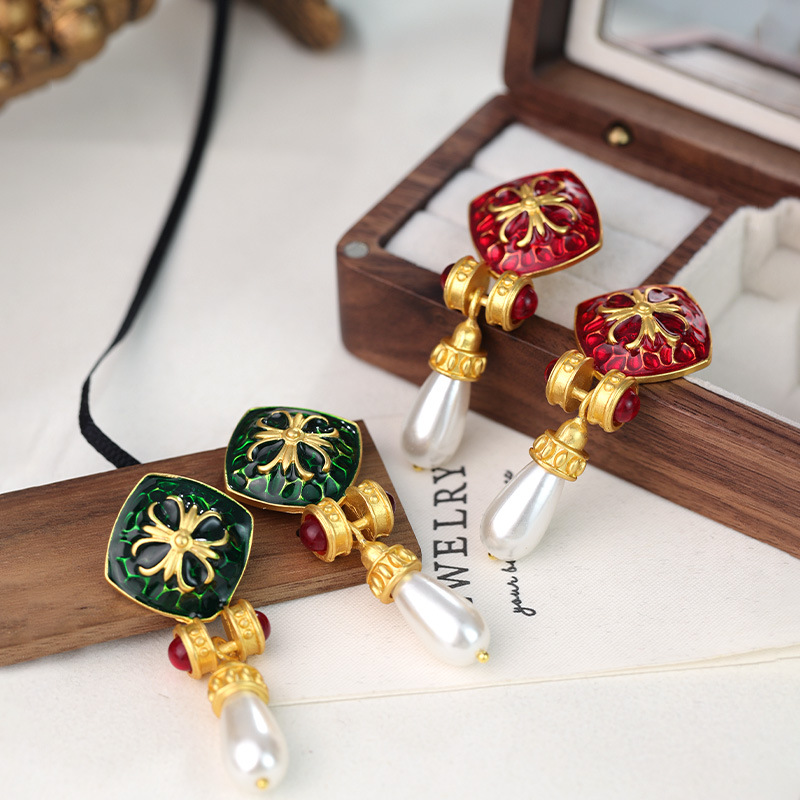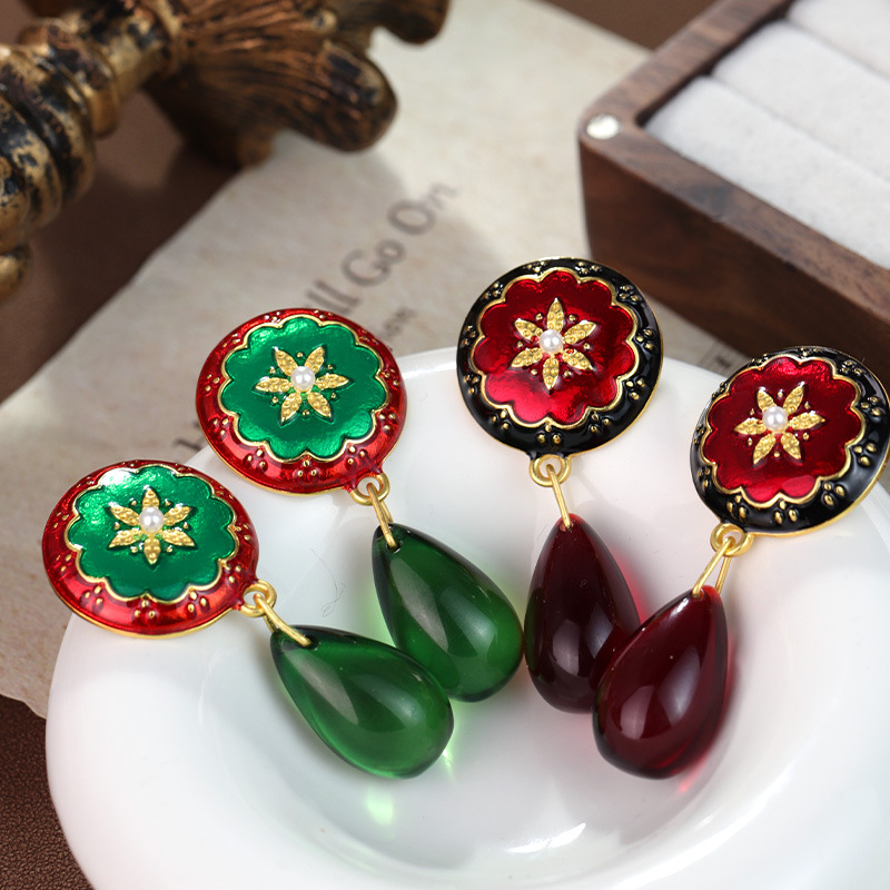 新しいフランスの中古風の赤い油は真珠の水滴の耳飾りの復古の花の高級感の優雅なイヤリングの女性をまねます。