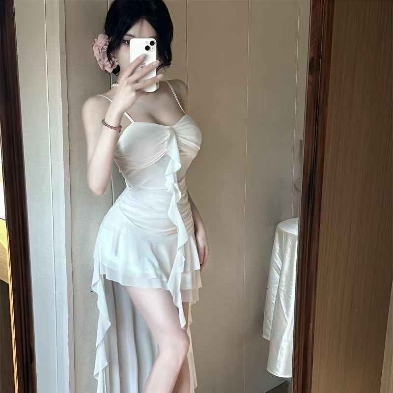 フレンチスタイルのスーパーフェアリーピュアデューティフリルスプライシングサスペンダードレススリムフィット不規則スカートシーサイドビーチロングスカート