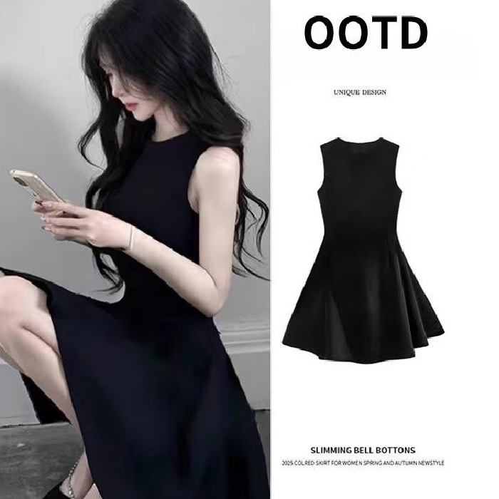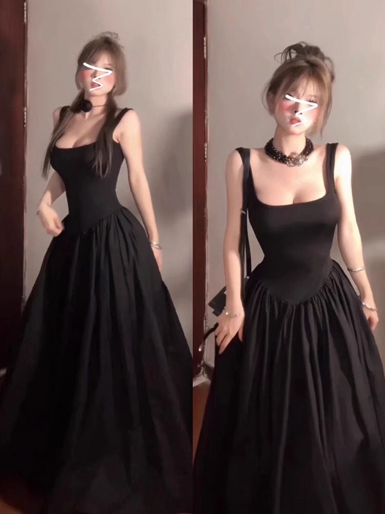 フレンチティーブレイクサスペンダードレスレディース2025年夏新作ハイエンド気質ウエスト痩身黒ロングスカート