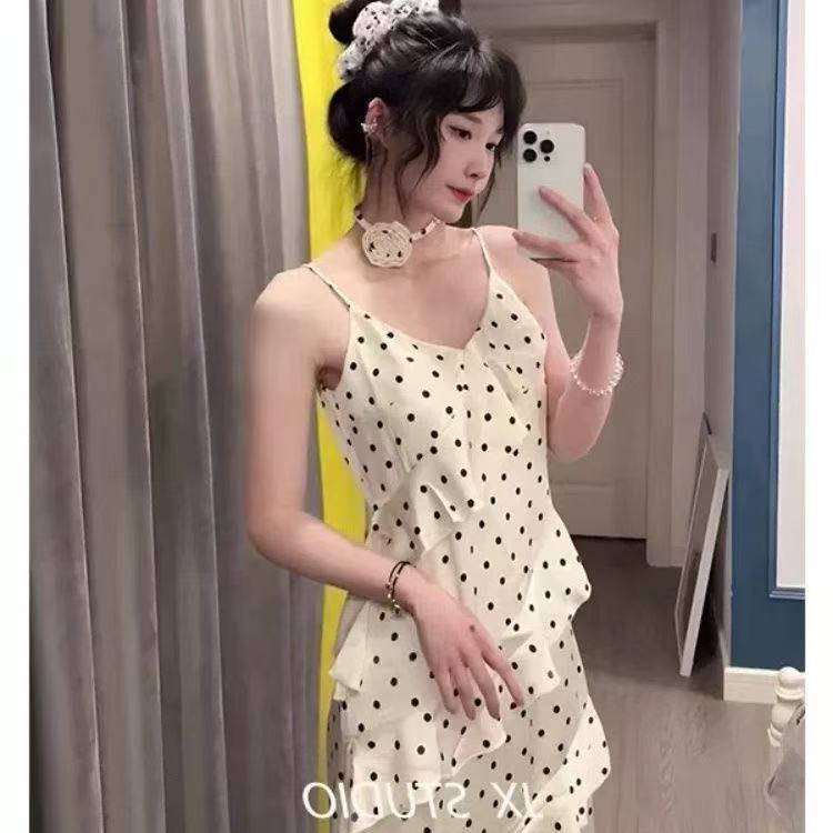 新しい 2025 フレンチスタイルの優しい水玉模様のサスペンダードレス夏のレトロなウエスト痩身ロングスカート女性のための