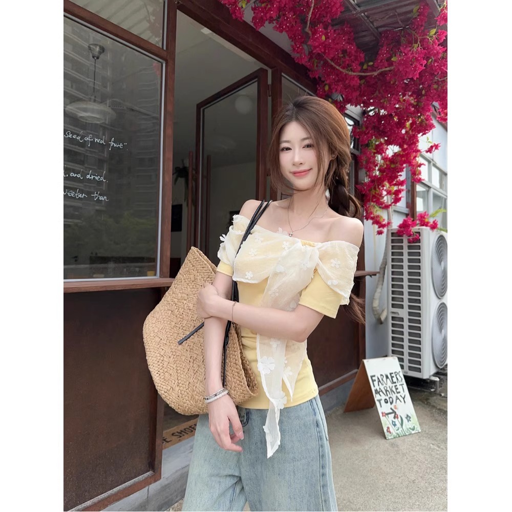 【広州生地オリジナルピンフラワー】レースステッチフラワーワンショルダートップスレディースウエストシェイプイエロー半袖T