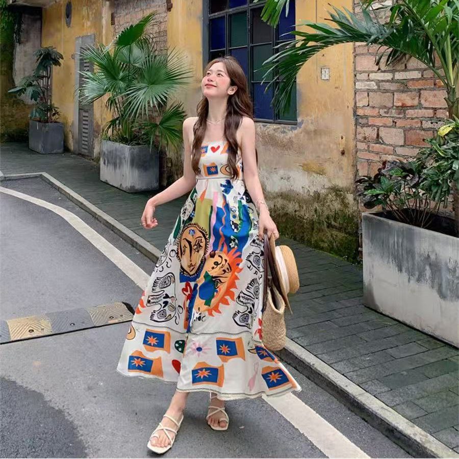 レトロエスニックスタイルサスペンダードレス女性の夏の海辺の休暇落書きプリントノースリーブベストロングスカート怠惰なスカート
