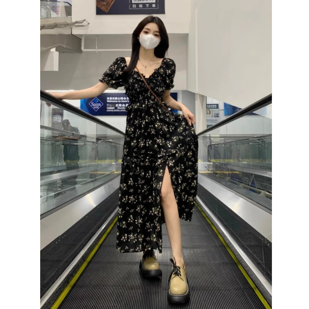 大きいサイズの優しいスタイルのフレンチティーブレイク花柄ドレス女性の夏のハイエンドファットMMサスペンダースリムお腹カバースカート