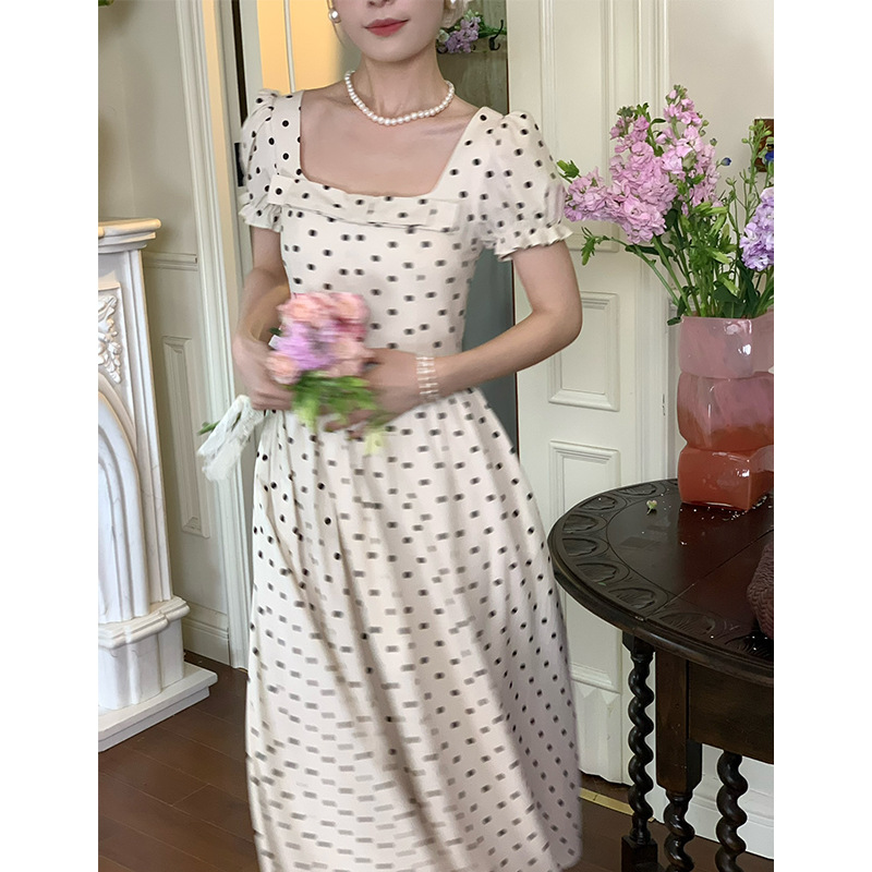 フレンチレトロニッチ白水玉半袖ドレス婦人服2025新しい夏の気質ウエストロングスカート