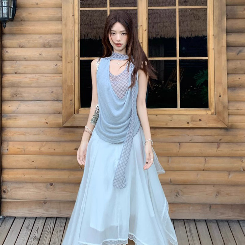 公式写真 実価 フェイクツーピース ブルーチェック柄 スイングカラー Tシャツ レディース 夏 ノースリーブ デザイン ニッチ オフショルダー トップス
