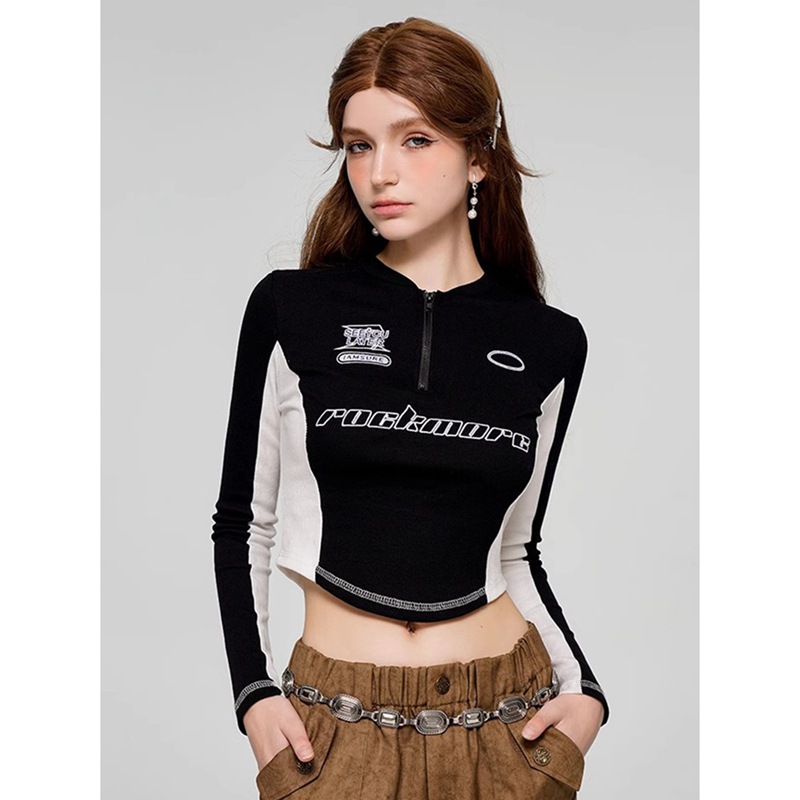 Jinliang 公式写真 [高弾性リブ] クールでスポーティーなスタイルのスリムコントラストカラーニットストリートホットガールトップ Tシャツ女性用