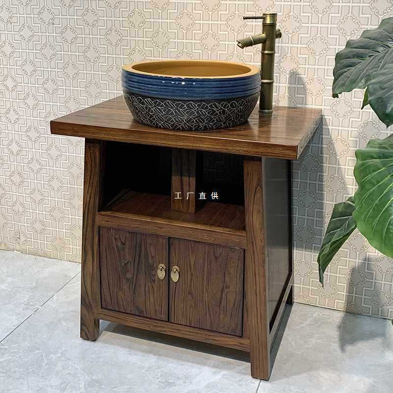老楡木中国式浴室キャビネットセット実木小戸型トイレ床置き式レトロ手洗い台盆キャビネットセット