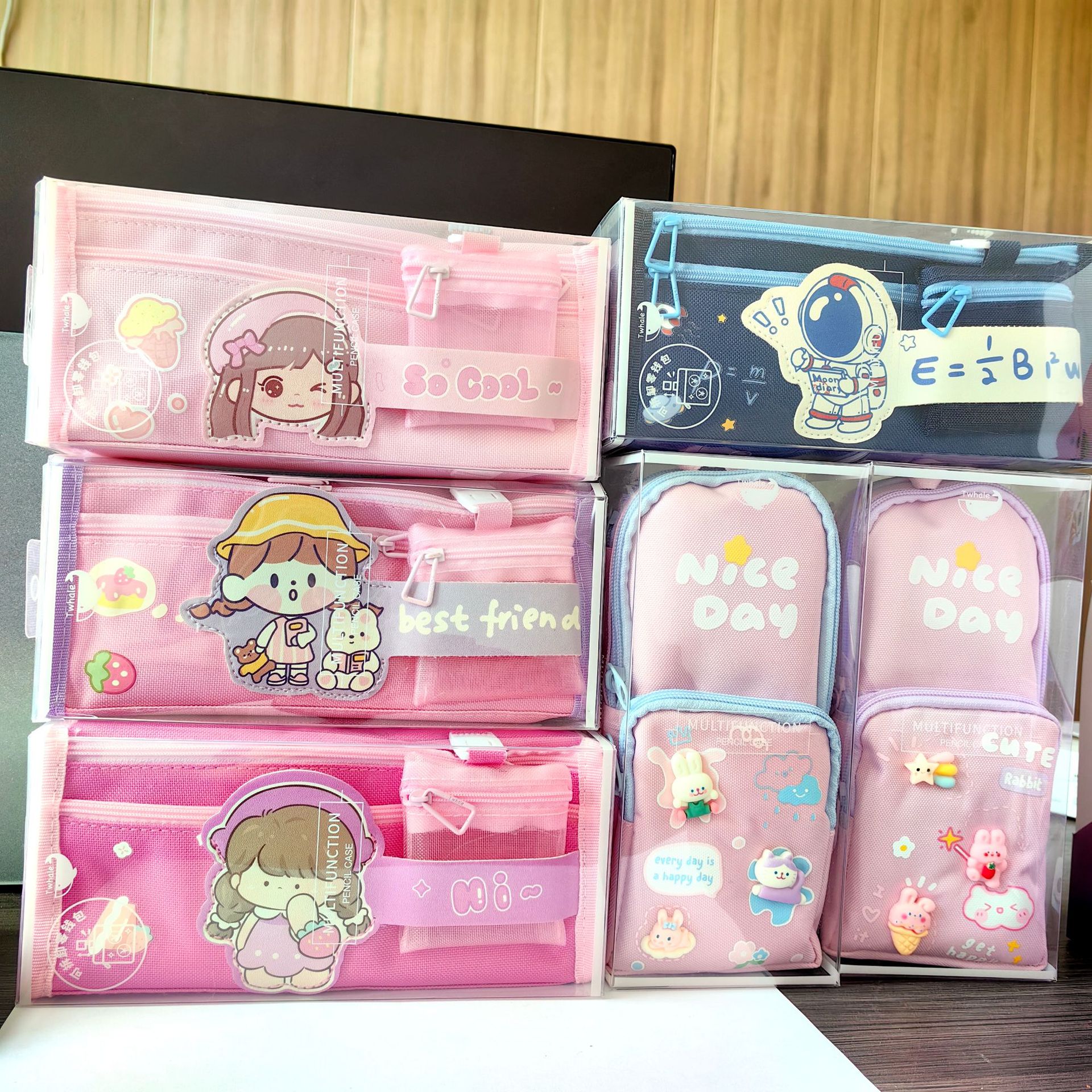 新しい大容量メッシュ鉛筆バッグ小学生用多機能筆箱多層透明かわいい漫画鉛筆バッグ