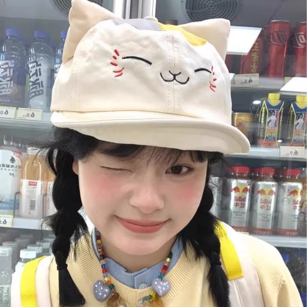 日本のかわいい猫の先生の夏目の友人の帳簿は軒のアヒルの舌の帽子の子供の春夏の日よけのアヒルの舌の帽子をひっくり返して顔を見せます。