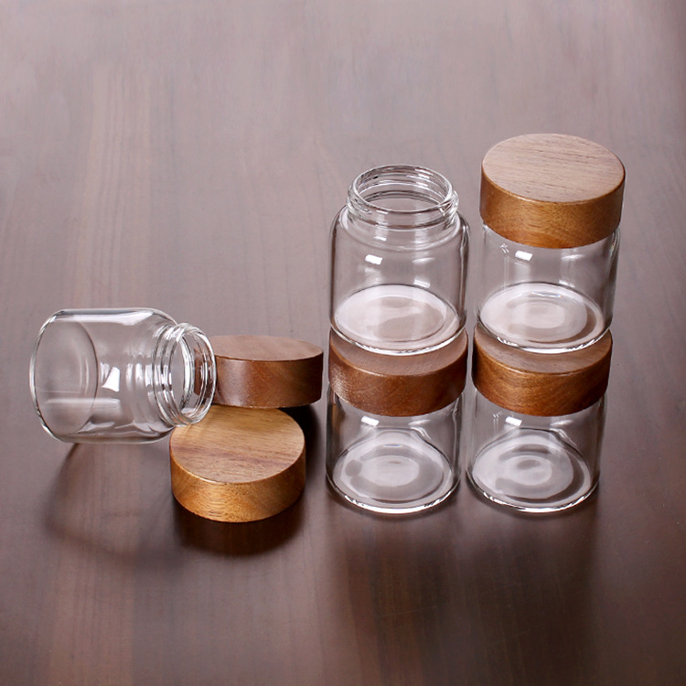 工場卸売り55mm高ホウ素シリコンガラス瓶90/120mlアカシア木蓋ねじシール木蓋貯蔵タンク