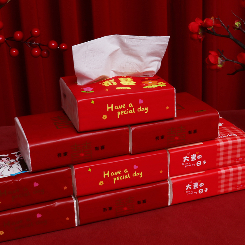 結婚祝いのティッシュの酒席は紙を引いて全部包んで披露宴専用の赤い使い捨てのナプキンの結婚用品の大全を包みます。