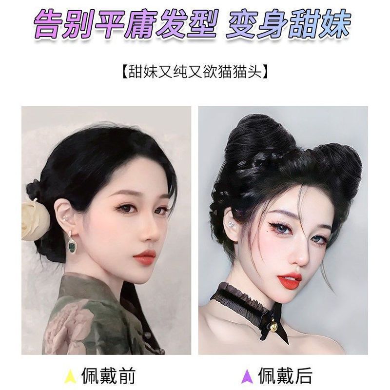 かつらの女性の団子の頭の猫の耳はシミュレーションして髪をつかんで挟みます。