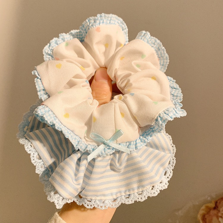 青い蝶結びのレースの髪輪のカラー波点バレエ風の大きい腸の輪は団子の頭の高級感の布芸の髪飾りを刺します。
