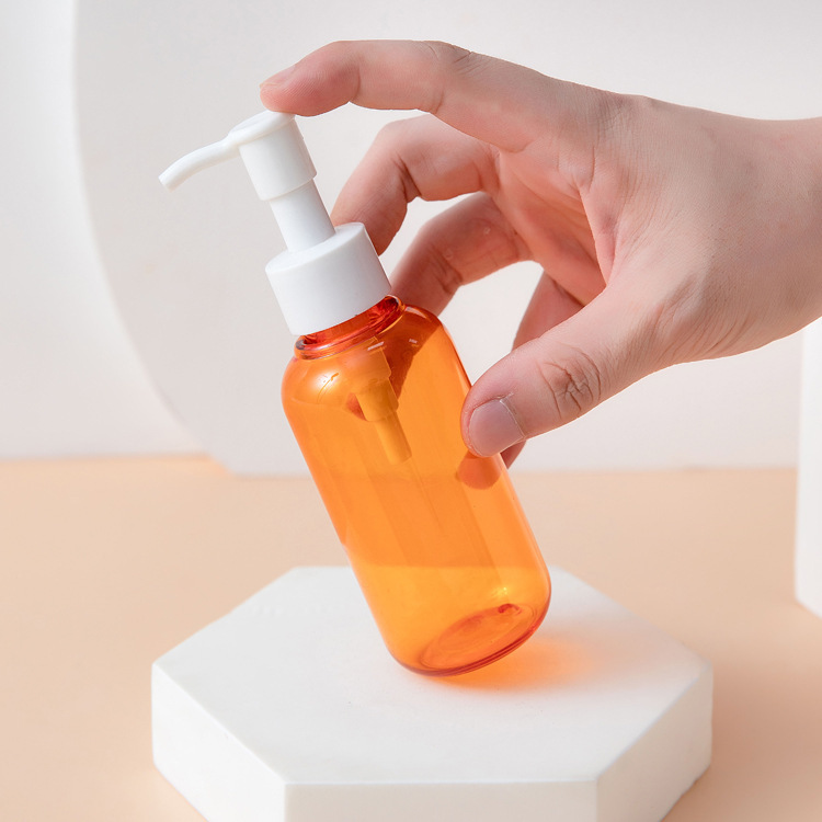 100ml茶色プラスチックボトルpetラウンド肩小容量スナッププラスチック圧力ポンプローション分注ボトルエッセンシャルオイルボトル