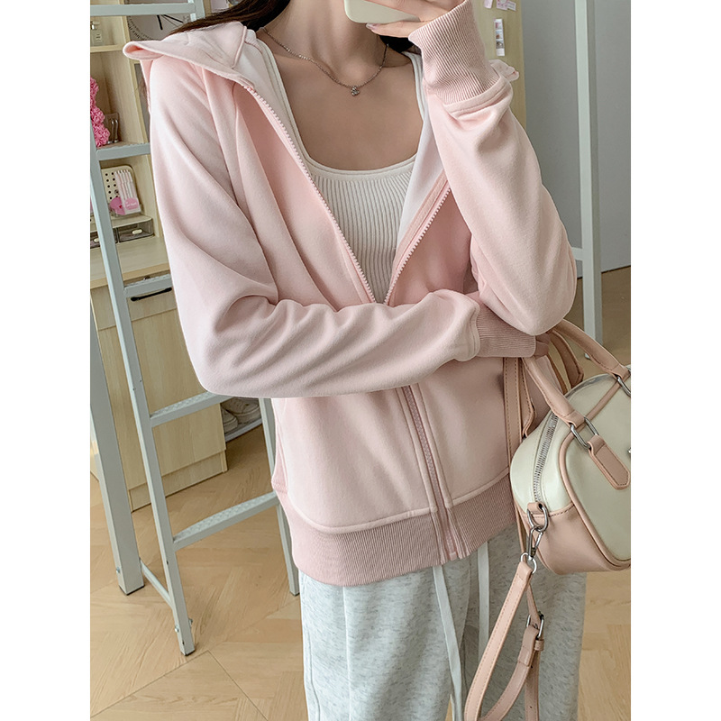 ピンクのコートの女性の秋の新型の怠惰な風のカーディガンの上着luluは同じタイプの修身をして帽子の衛衣とカジュアルに合わせます。
