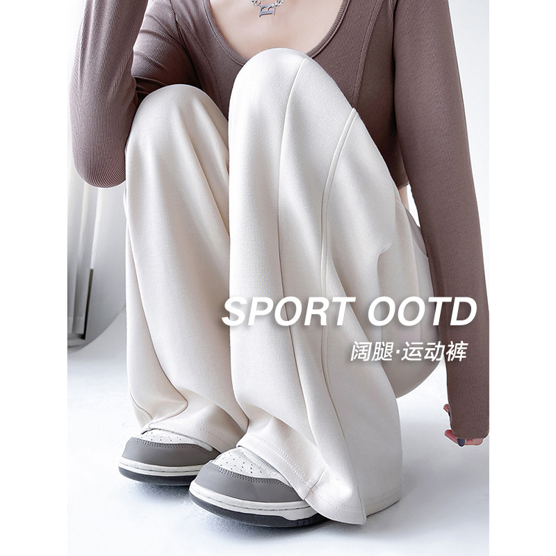 実拍2024春の新型の小さい皮のひもの乳白のカジュアルな広腿のズボンの垂れ下がった感の百合はやせているストレートのズボンの女性を現します。