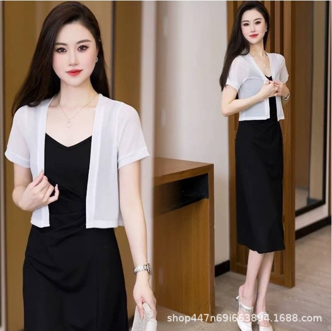 ショールサマーメッシュスモールコート、スカート付きトップス、カーディガン、サスペンダースカート付きレディース薄手ブラウス