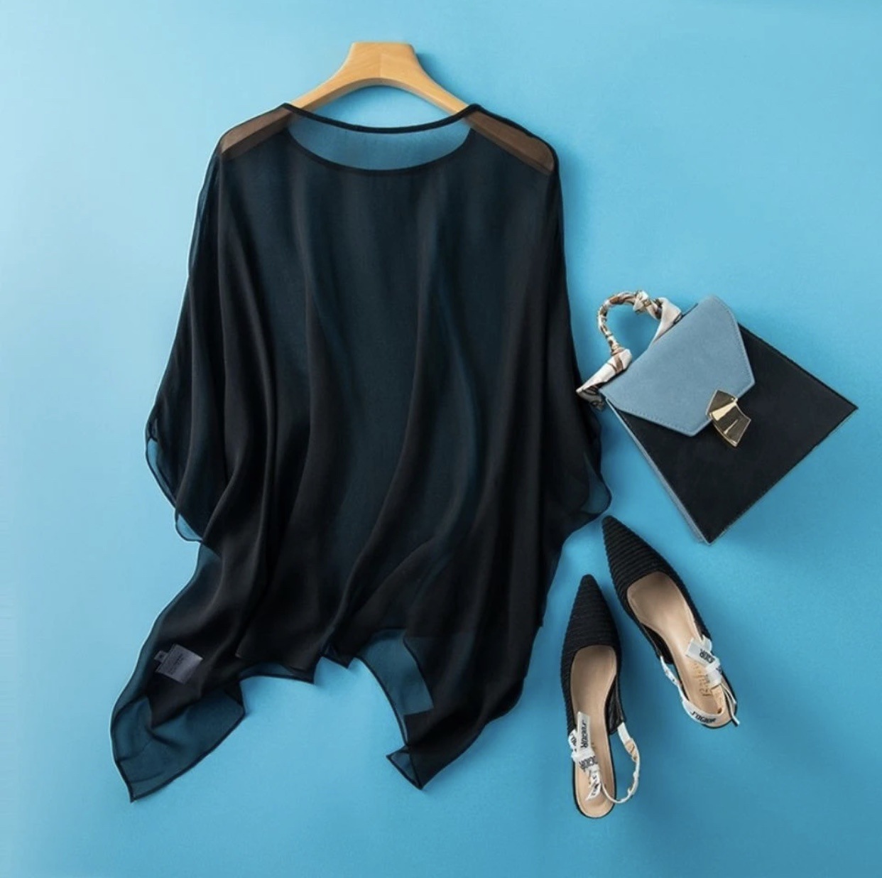 夏の気質の日よけの女性のボヘミアンの黒色の外は日焼け止めのゆったりした丸首の非対称の薄い糸のマントを掛けます。